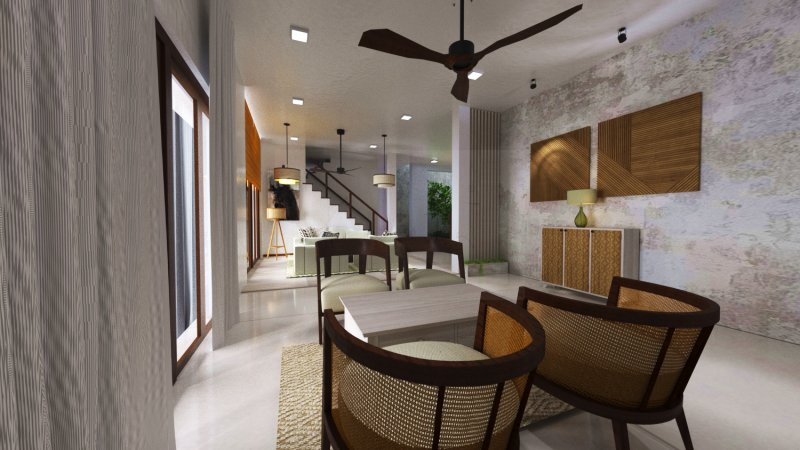 This residential interior design project is an impressive display of sleek and sophisticated style, brought to life through stunning 3D visuals. The concept centers around a light and airy color scheme with contemporary modern furniture elements, creating a serene and welcoming atmosphere. The living and dining areas are thoughtfully designed to optimize space and natural light, with clean lines and minimalist decor adding to the sense of openness. The use of white and light color tones imbues the space with a feeling of balance and relaxation, while also adding a touch of refinement to the overall aesthetic. The clever repurposing of existing furniture pieces adds to the cohesiveness of the design and creates a warm and inviting atmosphere in both the living and dining areas. A beautiful courtyard area also adds to the overall appeal of this exceptional residential interior design project.