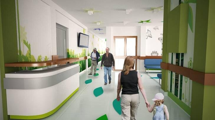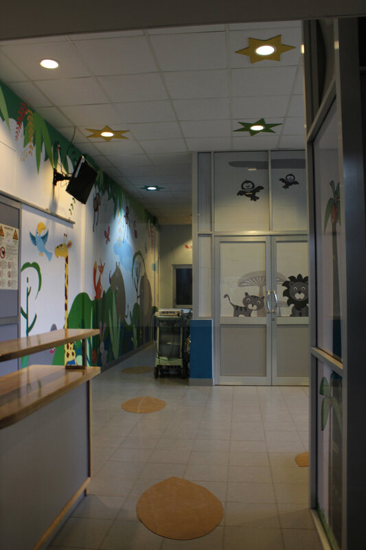 Our design for the MRI lobby was not just a simple lobby design. It had a special meaning for the kids who had to stay there until their next MRI scan. Many of them were frightened by the equipment and surroundings, so we created an environment to calm their nerves and provide a playful atmosphere. The lobby was filled with attractive wall paintings featuring familiar illustrations and stories. We added playful elements such as beanbags, whiteboards for drawing, and other play materials. The seating was ergonomically designed for both parents and children, with nature-inspired surroundings for the walls, floor, and ceiling decor, featuring attractive pastel color combinations to engage the kids' imagination.