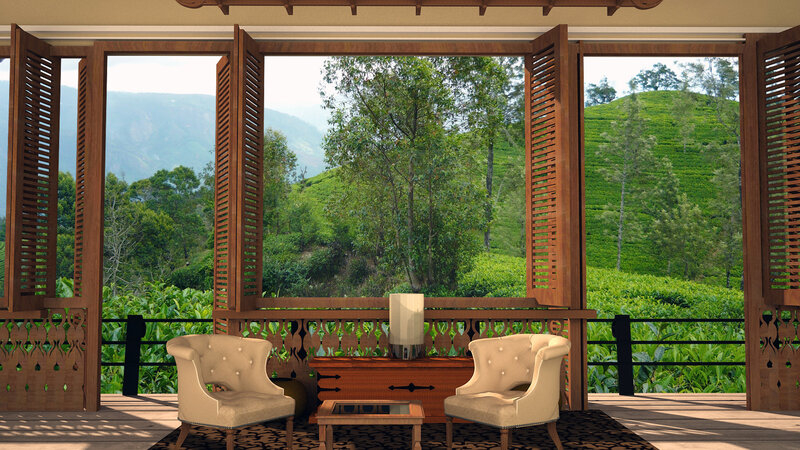 As social encounters become increasingly dependent on hotel entrance lobbies, it's important to create a memorable and attractive space for guests to interact and linger. For hotels in Sri Lanka, tropical themes inspired by colonial luxury are especially appealing to foreigners visiting the hill country. With direct views of lush green tea estates, the lobby at the N' Eliya hotel proposed by WBTE was designed with a European luxury interior influence and a tropical architectural combination. The use of wooden, minimally detailed colonial period furniture adds to the luxury living feeling and gives guests a real Sri Lankan natural experience with comfort. The hotel's corridors were also designed to give maximum viewing ability to showcase the mountain valley view and offer a quality service that sets them apart from other hotels in the area.